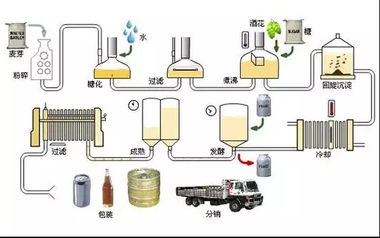 发酵:啤酒发酵是一个复杂的生化和物质转化过程,酵母主要的代谢产物是乙醇和二氧化碳,但也会形成一些列的发酵副产物,如醇类、酸类、酯类、酮类和硫化物等。这些发酵产物决定了啤酒的风味、泡沫、色泽和稳定性等各项理化性能,同时也赋予了啤酒典型的特色。